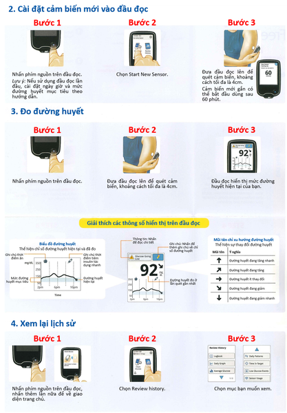 • Trong trường hợp nghi ngờ đường huyết ghi nhận được không chính xác, kiểm tra lại bằng máy đo đường huyết (lấy mẫu máu ngón tay) và đối chiếu. Trường hợp cảm biến hỏng/kết quả đo được nhiều lần không chính xác, cần thay cảm biến mới.