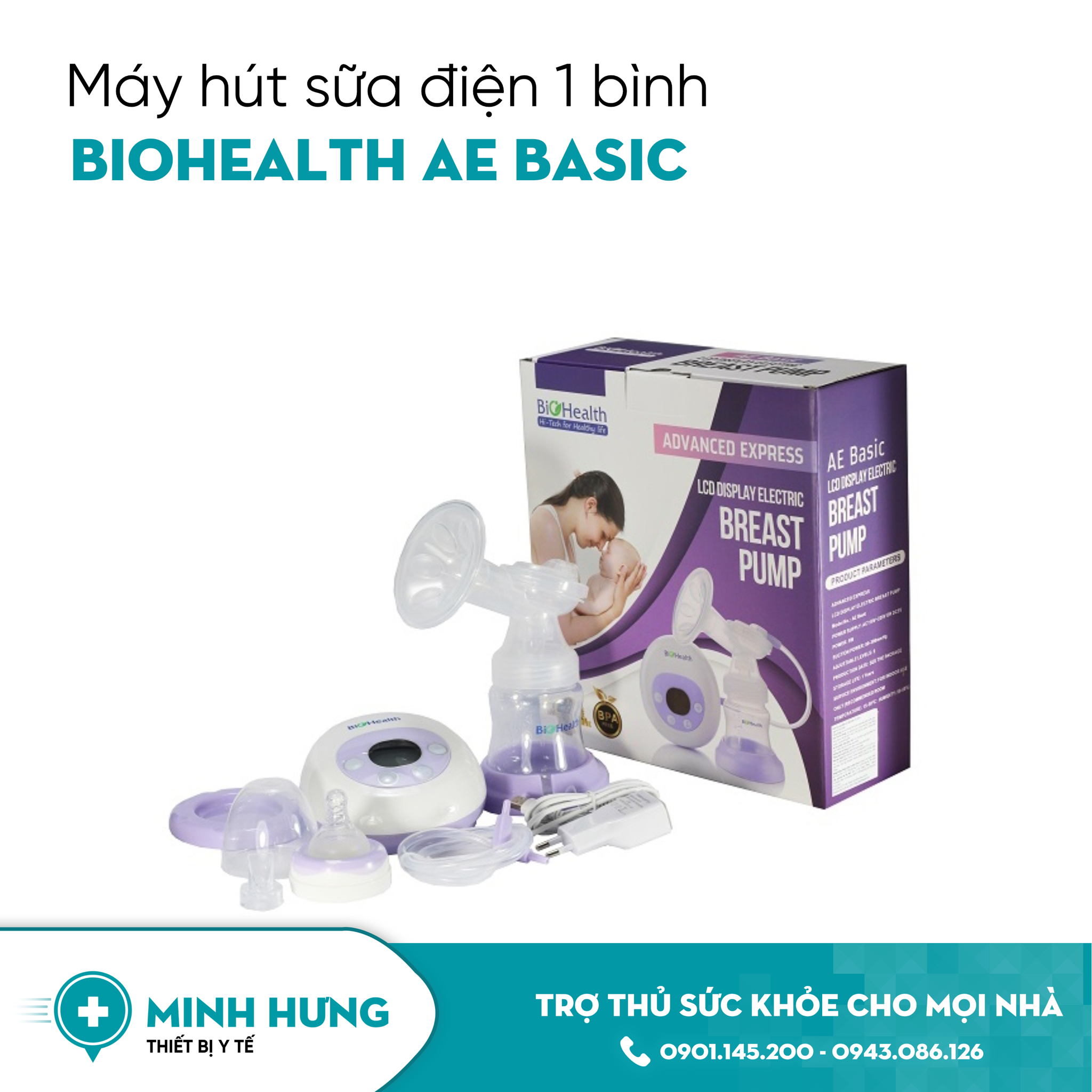 Máy hút sữa điện đơn BioHealth AE Basic thiết kế hiện đại, gọn nhẹ, dùng đơn giản, trợ thủ đắc lực hỗ trợ quá trình nuôi con bằng sữa mẹ an toàn, hiệu quả.