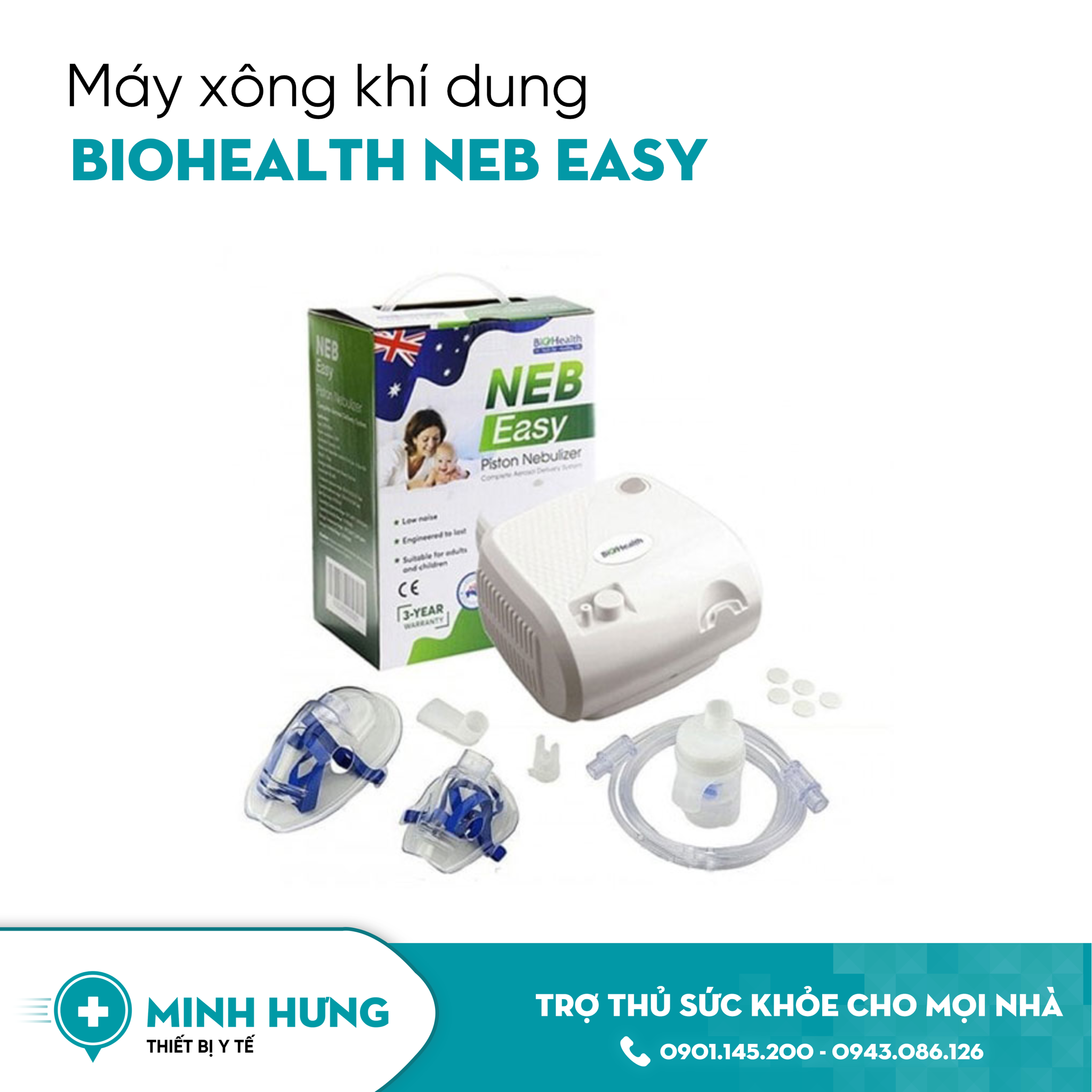 Máy xông khí dung NebEasy BioHealth nhỏ gọn, dễ sử dụng, tác dụng nhanh và tích cực trong việc hỗ trợ điều trị các bệnh đường hô hấp, giúp người bệnh dễ chịu, thoải mái, hô hấp tốt hơn. Sản phẩm được nhập khẩu chính hãng và phân phối bởi Thiết Bị Y Tế Minh Hưng với mức giá cạnh tranh nhất hiện nay.