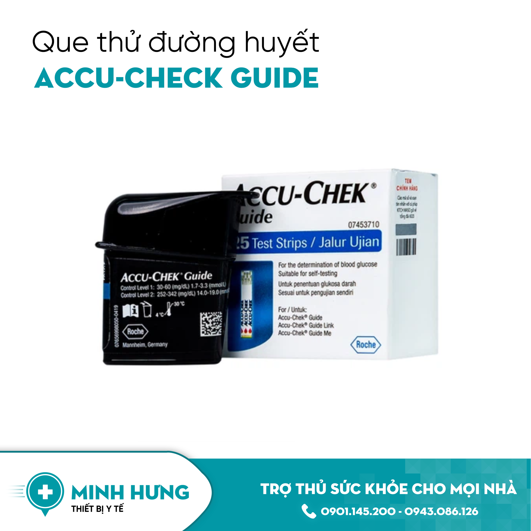 Que thử đường huyết Accu-Chek Guide (25 Que) được dùng cùng máy đo đường huyết, giúp kiểm tra, theo dõi đường huyết một cách thường xuyên, chủ động mà không cần đến trực tiếp tại viện.